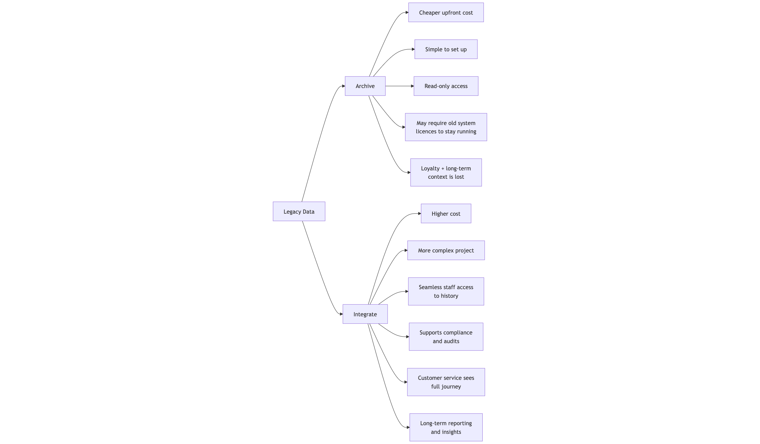 But archives come with trade-offs. Staff can’t search or cross-reference data in their daily workflows. That means customer service teams lose valuable context. Imagine not being able to distinguish between a brand-new customer and one who has been with you for 10 years or more. It makes loyalty invisible — and can weaken relationships you’ve spent years building.